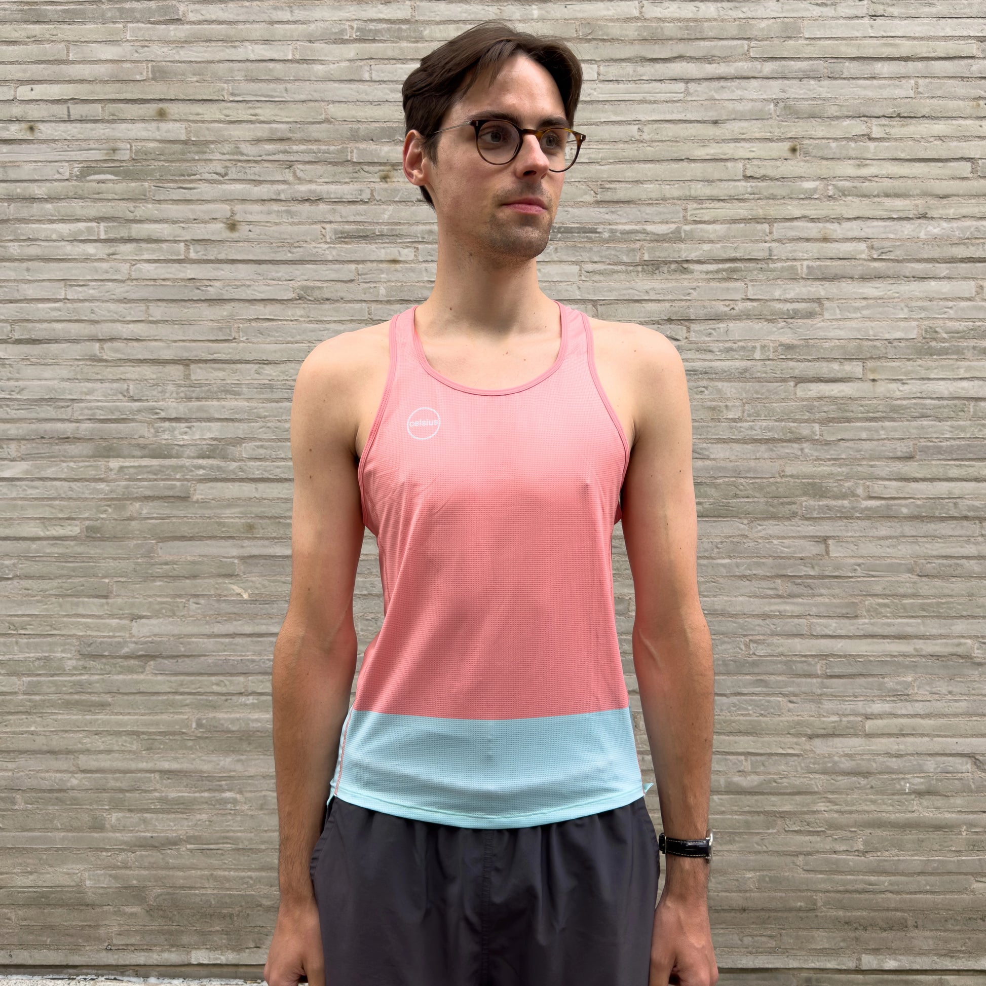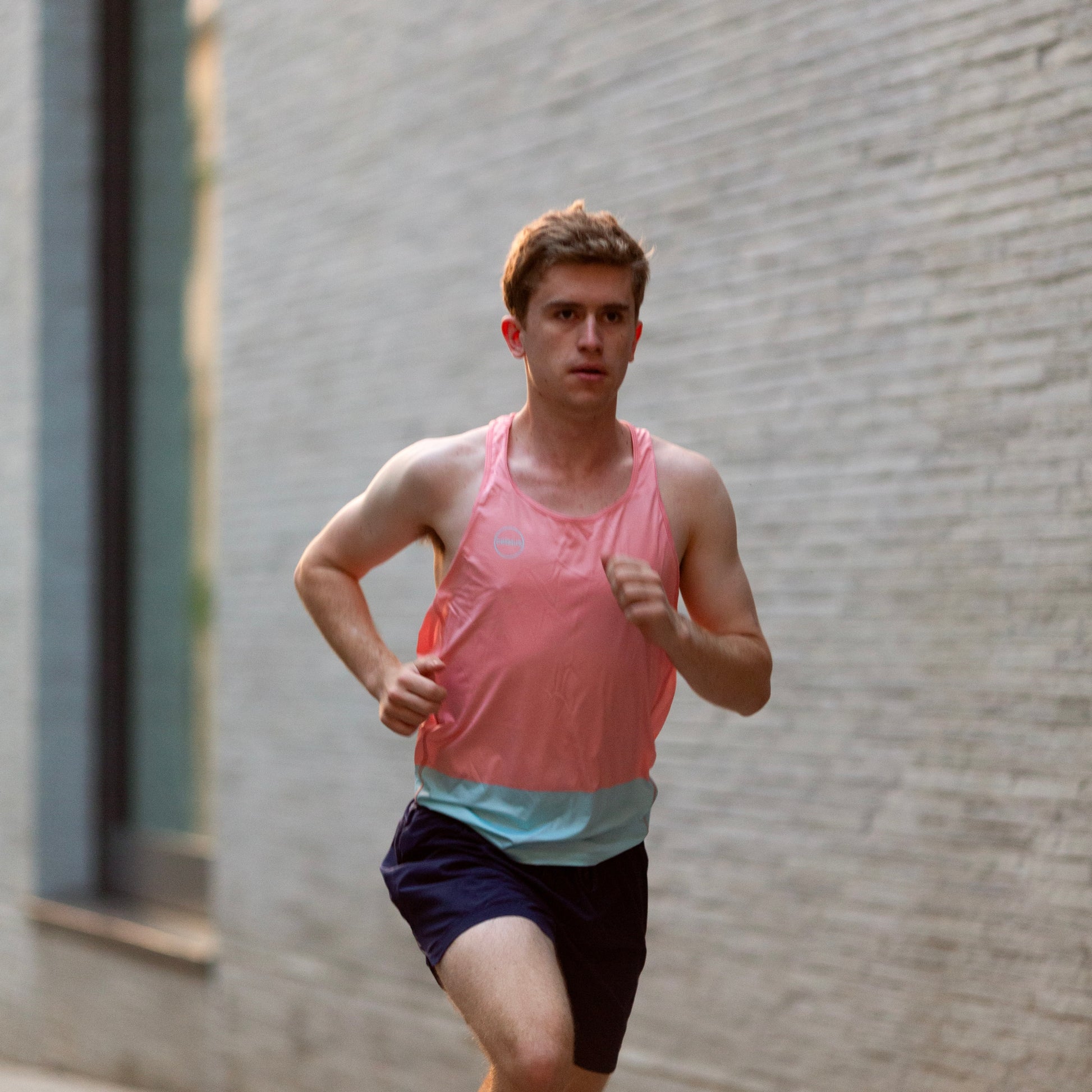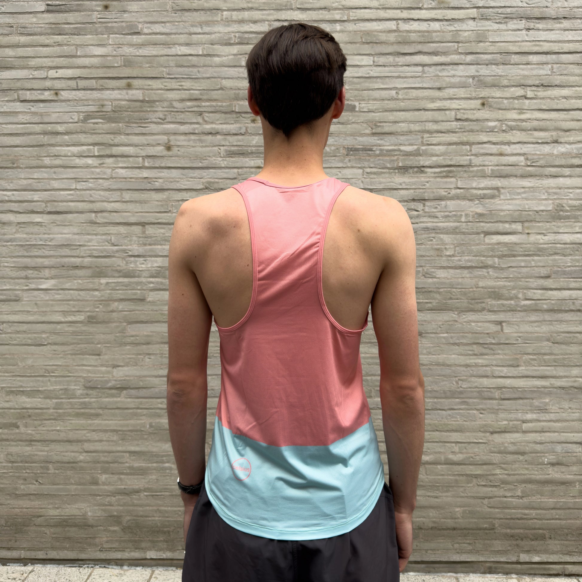 Lightweight high-performance running vest made using a recycled, breathable, and moisture wicking fabric.