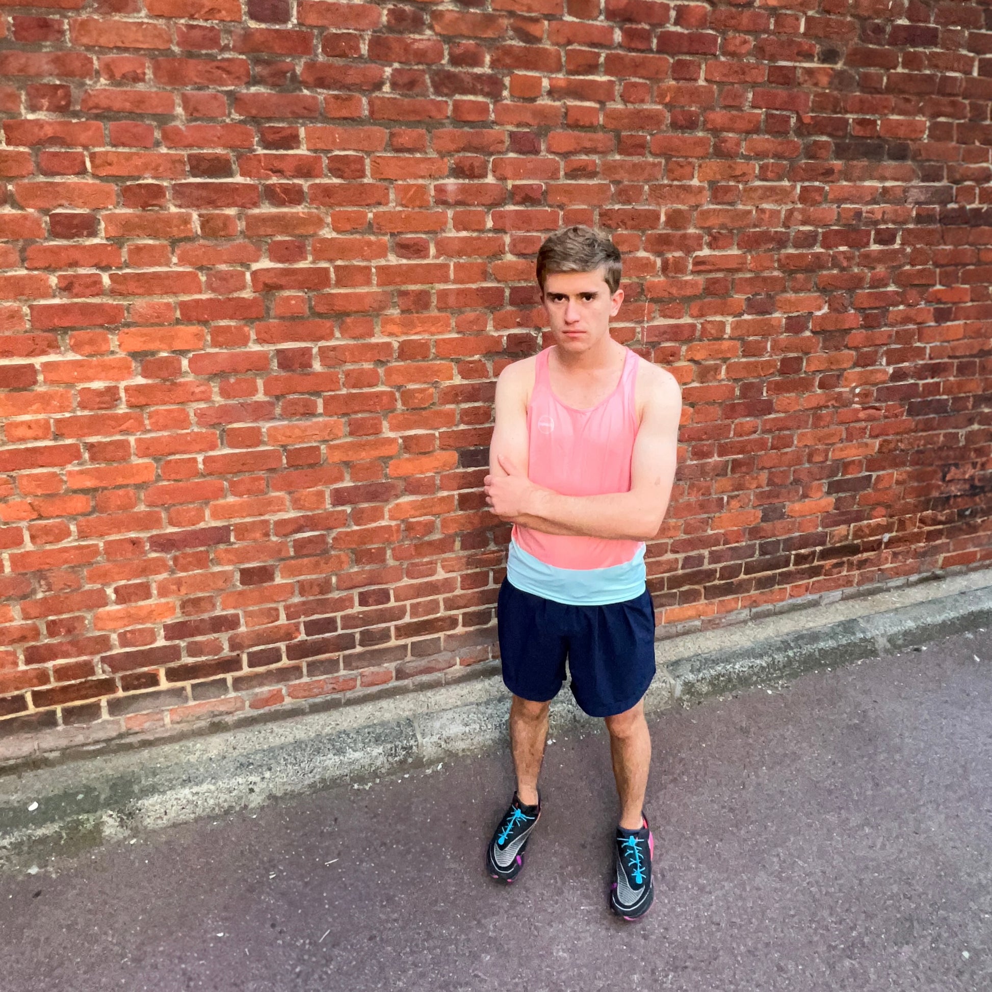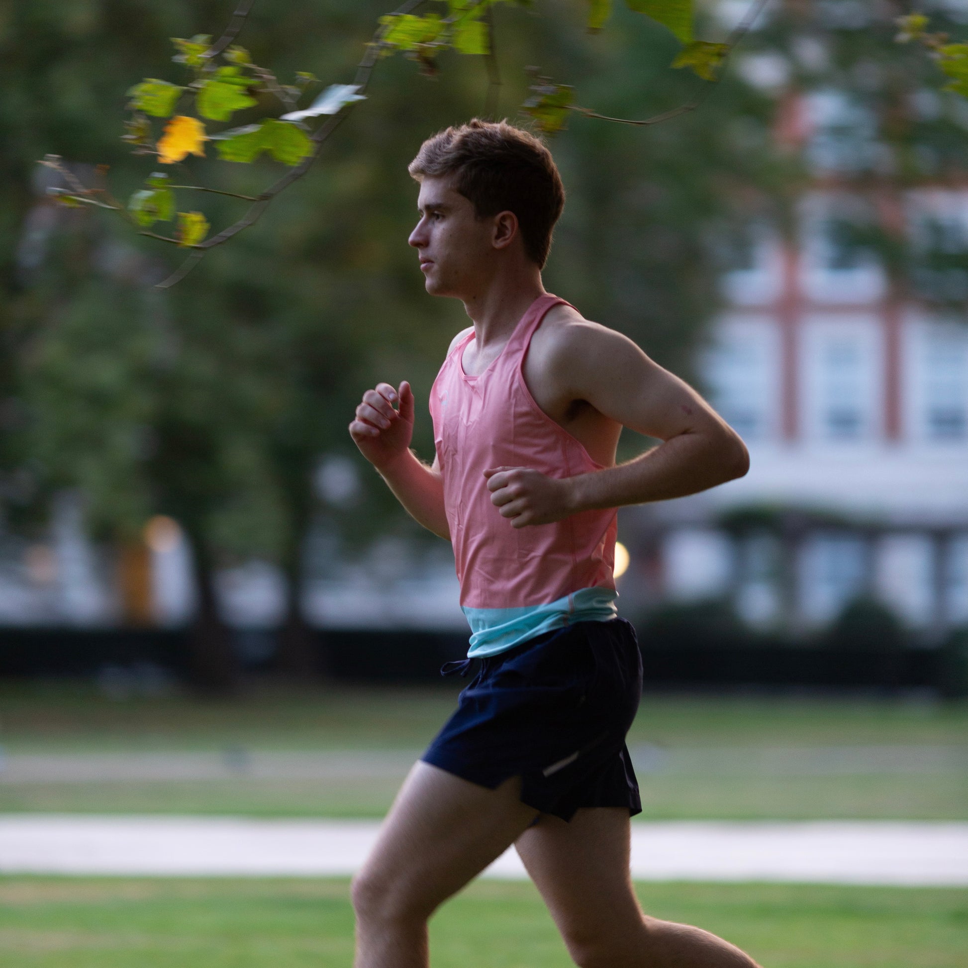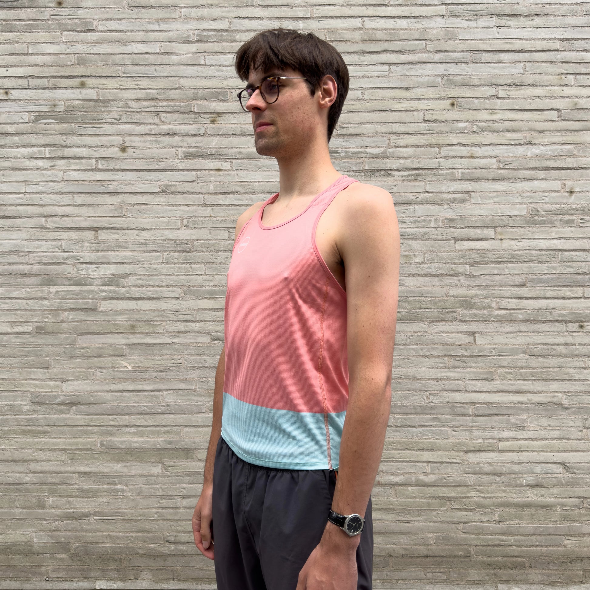 Lightweight high-performance running vest made using a recycled, breathable, and moisture wicking fabric.
