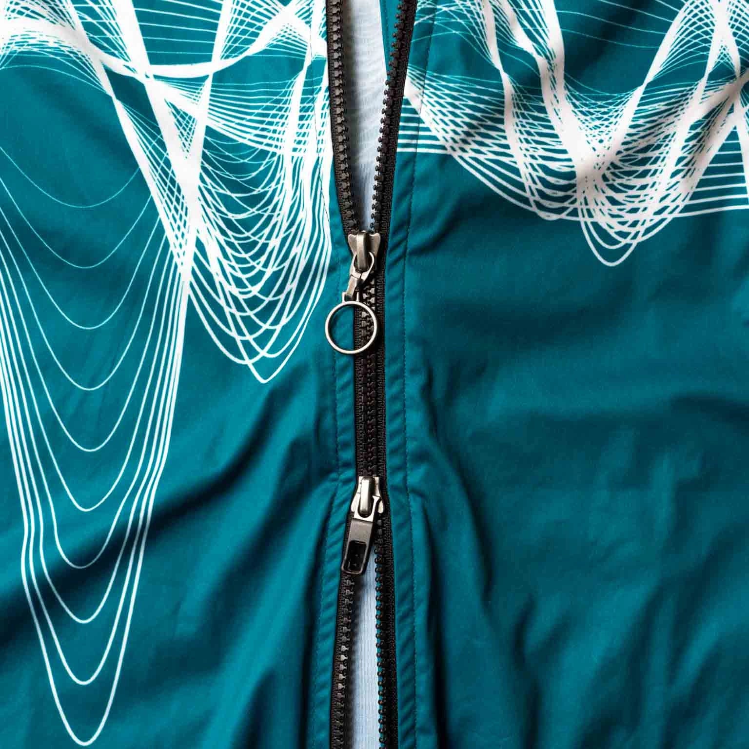 The design of our Sound Scape jersey is inspired by the changing sounds of the countryside. We took counts of different species of birds in London, and recordings of their songs. Complex sounds are made up of a mix of simple sound waves at different frequencies. We decomposed the bird songs into these harmonic frequencies and reconstructed them only keeping the most important harmonics from each bird. Each wave that you see on the jersey is a reconstructed version of a song from a different bird. Thankfully, there are still too many species of birds in London to put them all on one jersey, so the ones you see are the most common: wood pigeon, rook, skylark, magpie, herring gull, blue tit, and robin.